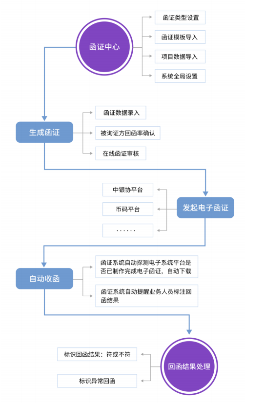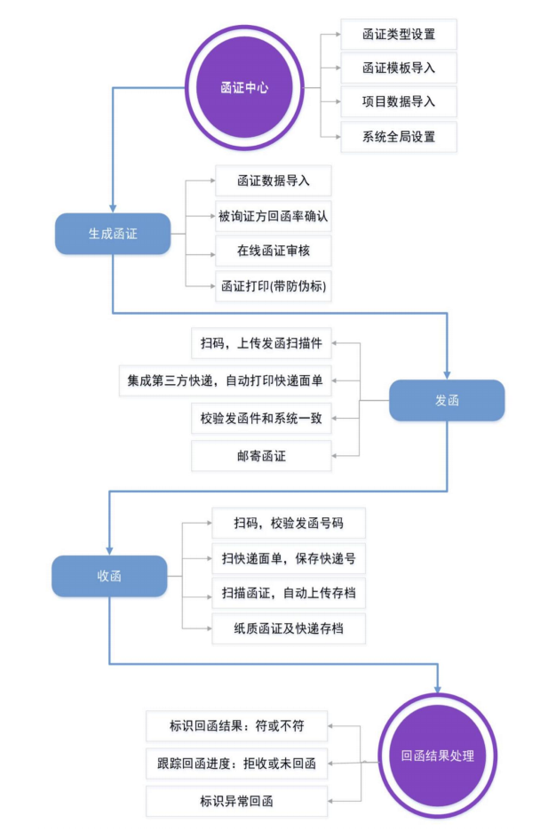函证管理系统是一套对函证进行全过程跟踪,实现函证规范化、集约化、数字化,提升审计质量与效率的数字化管理系统。通过信息技术手段提高制函、发函、收函工作效率,规范函证往来操作;实现证券公司、会计师事务所、银行等各种函证的批量生成—函证邮寄—物流跟踪—回函管理—异常检测—替代程序全过程管理;实现函证过程的集中管理、全过程留痕、电子化存档,有效提升函证效率和效果。
